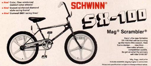 | 1978 | SCHWINN SX-100. Ad in BMX Action august 1978: Here's the new Schwinn SX-100 that will be burning up the tracks this season. New frame design... new tires... new color wheels... competition saddle. So get on what the winners will ride! $168.95. |