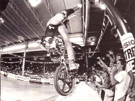 | Mat Hoffman, The Ride of my Life, 2002: My favorite part about the contest scene was the feeling of being immersed in bike riding, bonding with my friends one epic weekend at a time. Contests were about seeing the new tricks, kicking a little ass on the ramp, heckling my teammates, and at the end of the day, getting goofy at the Dennys dinner tables. All that began to change midway through 1987, at an AFA event in Columbus, Ohio. It was the biggest AFA contest to date, about 260 riders strong. Eddie Roman and I were amusing ourselves (and no one else) using a homebrewed geographic joke: With a cheerful expression, we'd approach other riders and exclaim, "Oh. Hi! Oh... The sport was booming, and the influx of new riders meant the manufacturers were pumping a lot of cash into freestyle bikes, tours, and teams. Each month the number of kids seemed to multiply and companies added to the sport, defining it with a contagious energy. T-shirts and 'zines were being created, forming the bike subculture that surged up from the underground. At the Ohio comp, it was evident how popular riding had become in a short time. There were thousands of spectators, and hundreds of bikers who swarmed like lemmings to the contest -some didn't even compete, they just came to ride. Ohio was one of the first contests where the extracurricular activities surrounding the competition overshadowed the event itself. Rebellion was in the air. Big parking lot flatland jam circles and allnight street riding were becoming the norm. Despite the best efforts of AFA president Bob Morales and his affiliates around the country, the riders at AFA events wanted more than just a contest. They wanted a scene. A lot of guys had traveled to Ohio on their own, unsupervised by parents, for what seemed like the first time. The host hotel was a Holiday Inn. It was inundated with riders who found power in the pack mentality-sometimes it was five or eight guys, plus bikes, to a room. Mayhem ensued. The telltale signs were all around -skid marks on the carpet, tire scuffs in the elevators, stickers on lampshades. And there was noise, constantly. High-speed, ride-by pillow jousts left the hallways littered with shredded feathers and giggling idiots. Room service trays were sent flying out of hotel room windows, clattering onto the sidewalk below. Patio furniture found its way into the swimming pool, Coke machines toppled over, trashcans were sent tumbling down stairwells, and fire alarms rang at least once a night throughout the weekend. The hotel managers were beyond irate and called in the cavalry. The flicker of red and blue police lights sent riders scattering like roaches-seeking cover in their rooms or taking off for the streets. This was repeated a couple times over the course of the weekend. Most people had arrived at the contest Friday night, and by Sunday morning, rumors were flying about bikers-versus-helicopter street chases with twenty or fifty guys trying to elude the searchlights. Many had been threatened by the hotel management with eviction from their rooms or had been forced out by the chaos. Legend was born when Large Ray, a freestyle cult figure, hatched a fist-sized turd on a napkin, then placed it in the continental breakfast kitchen microwave, set to "high." Ten minutes later, the odor swept through the hotel ventilation system and penetrated the entire building with a suffocating, sulfuric stench. Everybody needs to rebel against something, but that contest was an all-time low. I was satisfied just being annoying with my Oh-Hi-Oh joke. |