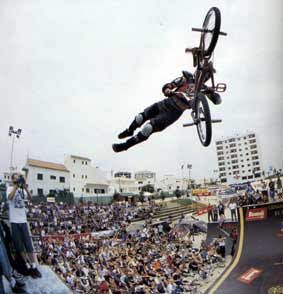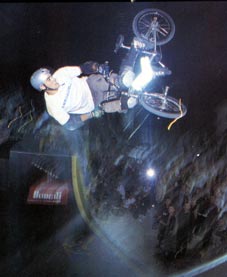 | There were two sets of jumps, one big set followed by a step-up. The landing on the first set was pretty flat and didn't give you enough speed to clear the step-up if you didn't land right. Racers were in favor here, but there were not many racers around. Last place went to, believe it or not, Jay Miron. Jay is not a racer and his bike weighs a ton. That combined with no practice might explain why he didn't get very far. Third place went to Thomas Wullschleger (Switzerland) who was pissed that he didn't pull his nothing on the first set to 360-X-up on set number two. Ryan Brennan (USA) did the fattest no-footed cancan ever-his legs were just too far away from the pedals to pull it off, but he did. This year there was no American champion because Timo Pritzel took the gold back to Germany. Timo did a clean flip on the first set and a no-footed flip on the second set, but it was the style and height that gave him the win. As Ron Wilkerson put it, "There's Vic Murphy, there's Dave Voelker, and there's Timo Pritzel." | DIRT 1.Timo Pritzel 2.Ryan barspinner Brennan 3.Thomas Wullschleger 4.Olivier Renard 5.Chad Kagy 6.Nick Cox 7.Marco 8.Patrick Guimez 9.Jacobs 10.Jay Miron |