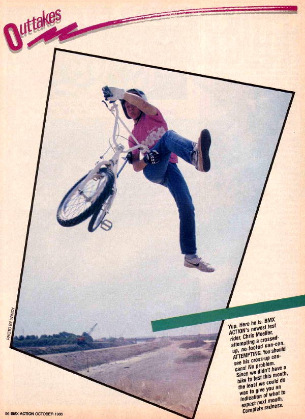| 1986 | PEDDLEPOWER. During the 1986 season, Chris rode for the National #1 Bike Shop team, Peddlepower, and helped test forks and frames for Privateer Bicycles. BMX ACTION TEST RIDER. Chris Moeller became a test rider for BMX Action Magazine. Chris: A long time ago I did a "Local Thrashin", and I was there and they were. And they needed a test rider, a medium-sized test rider, and I was medium- sized, so they got my phone number from my friend Mike Smith and they called me and then I test rode for them. Chris, www.os-bmx.com, april 2008: I started test riding for Gork and BMXA right after they did a Local Thrashin' article on our Lucky's trails in Huntington Beach in late 1986. I think my first test was a Raleigh 777 I rode at some trails in Santa Ana in late 86/early 87. I guess I got the job after Gork saw me ride at Lucky's. I was 16 when I started doing that. It was a lot of fun wrecking those bikes and I got paid. Plus I got my hands on a lot of parts that I could use or sell. Chris Moeller, www.facebook.com, february 2016: BMX Action magazine October 1986 issue. I was 15 years old, working part time for Chuck Robinson and racing on the Robinson Support team. This was my first photo shoot as the next BMX Action Test Team member shot over a road jump in an Huntington Beach oil field. Thank you @bmxergork for the opportunity ! Photo by Windy Osborn. |