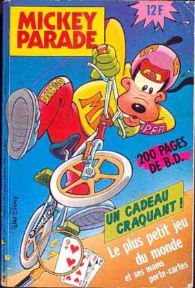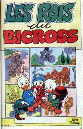 | Page 45: Les rois du bicross. Dans les rôles principaux: Donald, Riri, Fifi, Loulou et Picsou. Riri, Fifi et Loulou entendent une publicité à la télévision: En bicross, vous roulez partout ! Pour la détente comme pour la compétition, le bicross vous donne la victoire ! Ils échangent alors leurs trois vieux vélos contre un seul bicross espérant gagner les deux manquants en remportant la course de Pezville à la fin du mois. Pendant que les trois neveux montent leur bmx, Donald creuse une piste dans le jardin puis leur fait commencer l'entraînement. Le jour de la course, surprise ... Donald a acheté à ses neveux les deux bmx manquants. Les trois donaldvillois remportent la course. Le président du club de Pezville affirme que c'est de la chance et demande une revanche que Donald accepte ... L'entraînement reprend. Pour éviter de payer l'entretien du terrain autour de son coffre imposé par le maire, Picsou laisse Donald et les enfants de Donaldville y creuser bénévolement, une piste. Le maire de la ville et Donald ont vent de l'abus de Picsou et ce dernier est condamné à sponsoriser le club. Picsou provoque le président du club de Pezville, le perdant lors de la prochaine course paiera à l'autre équipe le voyage pour les championnats du monde à Venise. La nuit précédant la course, Picsou et le président du club de Pezville sabotent chacun de leur côté les bmx de l'équipe adverse. Le départ a lieu mais les roues se détachent, les potences cassent, ... HONTE aux deux saboteurs. Ils se repentissent et offrent à tous les enfants des deux clubs le voyage pour les championnats du monde à Venise. fin |