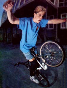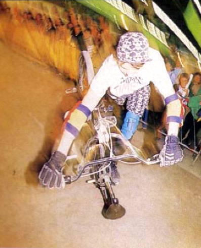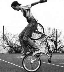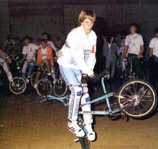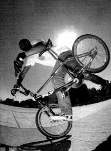The mc in mccircle does indeed stand for McKee. Freestylin october 1987: Marc McKee invented it, McCoy refined it, Denny Howell owned it. Ken Evans, october 2005: Denny Howell and I grew up as next door neighbors and we rode together all day every day. Denny did that trick in such tight circles that it literally looked like his front wheel never moved from one spot and he spun faster than everyone else on that trick. Denny came up with a similar trick on the back tire - someone dubbed it the "Howell Spin" but I don't know if it ever stuck or not. |