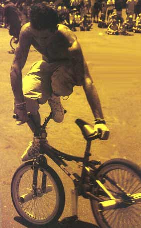 | megaspin | BMX Plus! july 2000: One of Jason Parkes' early rolling and spinning moves. One foot on the rear peg and the other kicking the tire as the byke spins on the back wheel. Megaspin to tailwhip air to megaspin. Martti Kuoppa. 2006. |