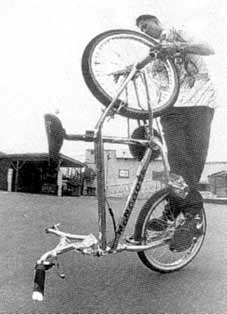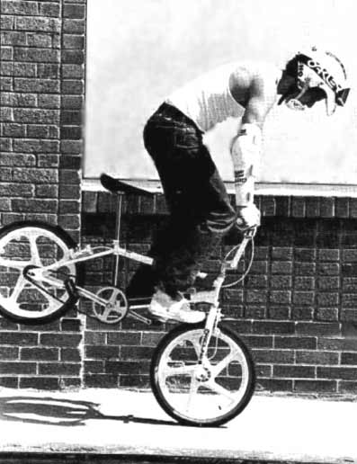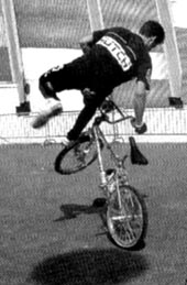 | cherrypicker | A new level of difficulty. The rider places a foot on the rear tire behind the bottom bracket and swings their other leg over the head tube and rests the other foot on the seat tube. Then either using the handlebars for stability or clamping the legs tightly, the rider bounces up and down causing the entire bike to hop on the rear wheel. En français, celui qui cueille les cerises. The cherrypicker is one of Martin Aparijo 's inventions. Derek Oriee, www.vintagebmx.com, february 2005: Urban legend states that Martin Aparijo invented the cherry picker on a skateboard first before converting it to a bmx freestyle trick. Martin Aparijo, BMX Action Bike march 1986: A lot of tricks are invented by making mistakes. You go out and ride, you do something wrong, you make a variation on it and it kinda goes from here. The cherrypicker got invented 'cos we used to do the trick where you ride the bike like a uni-cycle. The thing is you can't actually ride the bike so I thought I'd try and pogo it, so I went in my garage and held on to the roof, stood on my bike and pogoed it. But getting in and out of the cherrypicker was a completely different story. What I'd do was I would just get myself up there and I'd just let myself fall. Then I'd figure out where the pedal is. I'd reset the pedal and get back up. I learnt how to get out the trick before I could get into it. |