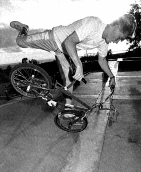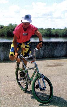 | miami hopper | The rider stands on the pedals and grasps the seat tip in right hand, and the front brake lever in left hand. The rider quickly applies the front brake and simultaneously rotates the handlebars 90 degrees counterclockwise towards the seat and pulls up sharply on the seat. This will cause the rear of the bike to rise up and seemingly flip over the front. If landed correctly, the front wheel will lay parallel to the ground and the right handlebar grip will be balancing on the ground leaving the rider perched above the rear wheel. From this position, the rider can make various poses, kick the bike out to the side and lay it down, or lean back sharply and reverse the trick and ride away. *note* the hands and handlebar directions would be reversed if the bike was set up with the front brake lever on the right hand side. Miami hopper first appeared in the march 1985 issue of BMX Action. R.L. Osborn, BMX Action march 1985: When I was doing some freestyle shows in Miami, Florida, this winter, saw one at the locals do the trick. His name was Paul Hopper, and he's a really nice guy. After I got this trick wired, I came up with a few variations of my own, and since Paul had no real name for it, I'm calling it The Miami Hopper after him. Before I go any further, I just want to remind you folks that trick riding can be hazardous to your health, so ABSOLUTELY use your safety gear - helmet, elbow pads, gloves, and long pants at the minimum while you're learning this or any trick. Whether you use it after you've got the tricks wired is up to you, but use your best judgment. Now, on to the trick. The Miami Hopper is an advanced maneuver; a beginner shouldn't EVEN try to do it. You should know how to do a bar endo, which some people also call a dip, before you' attempt this. I'm just going to show you how to do the basic trick, and you can work on the variations later once you have everything dialed. The first thing you do is roll forward slowly, standing on your pedals with your knees slightly bent and your weight back. Then, like a front brake endo, you start by grabbing the front brake and throwing your weight forward while you let the rear of the bike come up into your body and you tuck your buns WAY back. But for The Hopper you have to do a few other things in rapid order. As you grab the front brake you quickly crank the bars to the left so that they're at a 90 degree angle to the rest of the bike. Make sure you keep the front brake locked at all times. Then you let go of the bars with your right hand and use it to grab the back of the seat. This makes it easier to tuck WAY back and gives you more control for balancing, As the endo progresses, let the bike go all the way forward so that the lower end of the bars gently touches down on the ground. Between the front wheel and the end of the bars, you're now set up on sort of a tripod. Your front wheel will probably be flexing a whole bunch. At this point, you're constantly trying to find your balance point. You'll be twisting the bars and the bike back and forth so that the rear end of the bike stays pointed skyward. It helps if you leave your left hand on the grip and front brake lever, but bring the bars around until you can grab both the grip end AND the front of the seat in your left hand while still keeping a two-finger death grip on the brake lever. Balance for as long as you can. Then, to get back to the normal riding position, move your hand from the back of the seat to the halfway point of the seat post, lean forward slightly, and then throw your weight back HARD 'cause it's way harder to get out of this trick than it is to get into it. The faster you pull back, the easier it is to keep your balance. As the rear end is heading back toward Mother Earth, release your hold on the seat post, straighten out the front wheel,- and grab the right grip. Hold onto the front brake lever until the back wheel reaches the ground. When the back end touches down, you'll naturally go for a short rollback, and then you just ride out of it. That's it !! The Miami Hopper took me about three days before I had it down. I recommend that riders learning this trick put the bike in the vertical position and then practice how to balance before trying to ride into it. Jason Weatherly, www.pedalbmx.com, november 2005: The miami hopper was first called a "bar endo", then a miami hopper (which was kinda dumb because at first no one "hopped" a miami "hopper"), then when they started hopping them they became "miami hop hops", then with locking levers there came no-handed miami hop hops and then finally like 1986 or 87 Martin Aparijo pulled the no-handed bar spin miami hop hops, where he would flip the bars between hops. Brett Downs, www.pedalbmx.com, november 2005: The bar endo probably preceeded the miami hopper. RL Osborn was doing shows in Miami when he met a guy named Steve Hopper doing the trick. RL did a how to in BMXA and gave it the name Miami Hopper. Park Carter did no handed miami hop hops in 87 or 88. Danny Barrado, august 2007: My name is Bong Air and my trick is the Miami Hopper which was named after my riding partner Hopper Paul by R L Osborn when he visited us in Miami in 1984. The event was the World of Wheels auto show at the Hollywood Sportatorium. There was a contest for BMX TRICKS run by MCS bicycles and NFA.This is where the BAR STALL (Miami Hopper) was first used in a contest.The announcer said here is Bong Air, I roll out on my Haro Freestyler, open up a tallboy can of budweiser and pound it. Then I went out and did all the latest tricks flawlessly including the bar stall on the top of the wedge ramp, I gave it my all and from the crowd response I knew that I had won without a doubt. They gave me third place, team MCS got first and second. I confronted the judges and they said they didn't like the way I drank a beer. I told them to go to hell.The fool they gave second to had a cast on his broken arm and the other guy was lame. R L was 