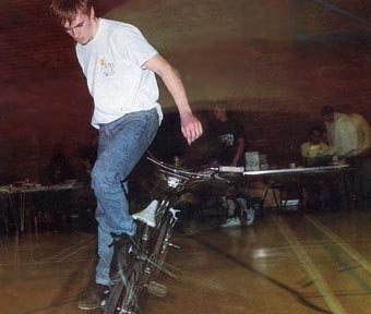 | backward | Jason Harrison, august 2005: I used to ride as a regional pro in the southeastern US for General Bikes from around 86 / 87 until 1990. Back when forwards rolling tricks were just coming into their own I flipped everything backwards and to the best of my knowledge I was the first person to come up with the following: Note: Backwards means that I flip the bike 180 (first half of a rock-walk) at medium speeds and start the following tricks rolling backwards. • Backwards Hang 5 (1987) • Backwards One Handed Hang 5 (1987) • Backwards Cross-Footed Hang 5 (1987) • Backwards Hang Nothing (1987) • Backwards Whiplashes (1987) • Backwards Hitchhiker (1988) • Backwards Cyborg (1987) • Backwards Hang 10 (1987) • Backwards One Handed Hang 10 (1987) • Backwards Ashtray (1987) (An elbow glide variation – flip 180 to rolling backwards, step to the side of the bike, throw a whiplash and catch the seat with your elbow as the whiplash comes around - sort of like in an ankle-death position, but back end off the ground in an elbow glide – once the seat is caught you immediately swing into a tight circle rolling backwards for a couple of rotations – I’ve never seen anyone else do these to date – it was called an Ashtray because of the round circle you would end up doing at the end (like a round ashtray) and because it was a fairly hard trick that “burned” most of the riders who tried it in and around where I rode the most.) • Backwards Cross-Footed Ashtray – Same as above, but opposite footed. (1988) • Rollercoaster – A G-Turn standing on the rear pegs to a decade off the rear pegs (1986) • Combo #5 – Backwards hang 5 to a cross footed backwards hang 5 to a backwards, cross-footed backwards whiplash, to a smith decade out. (there is another variation that replaces the smith decade with a gyrator to a smith decade and out, but that one came a bit later) (1989) I can still do all of these tricks today and ride as often as I can despite being the owner of my company, married with two daughters, and just turned 37 years old. |