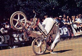 | backward decade | Jeff R.: Joe Gruttola was doing these in 87' I believe. Freestyle BMX UK april 1988 how to do: To do this trick you must know the bike like your own body. Jason Webb goes around in backward infinity roll, then when he's ready and not before, he jams on the back caliper, launches off the rear tyre and floats around the head tube. He makes sure his right foot contacts with the frame again, sort of sits down on the bars and rides away. |