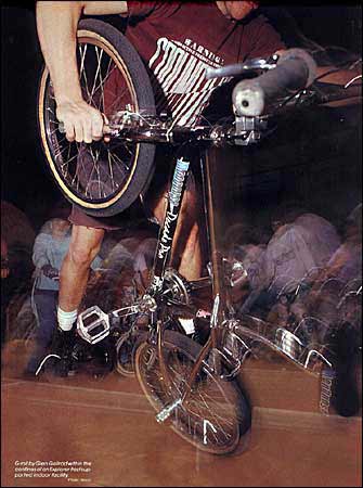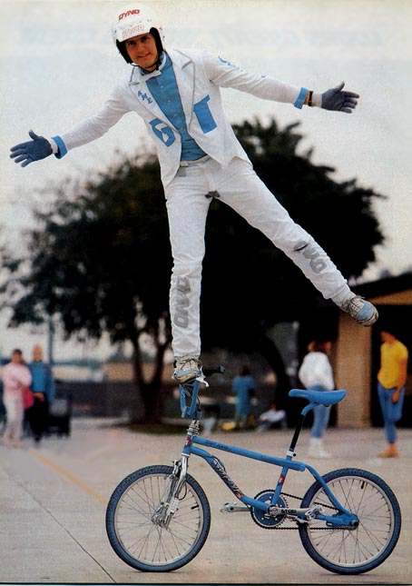 | switzerland squeaker | RL Osborn, BMX Action september 1985: I started wheel-walkin' about a year ago, but I was standing on the front pegs. It was a variation for front wheel hops. Then, I saw Martin Aparijo and Eddie Fiola doin' it the same way. All three of us were attempting to perfect it using the front fork pegs. Then while I was in Switzerland (in May), I tried doing it with my left foot on the pedal and I got it dialed. I haven't seen Eddie or Martin since I got back, so I don't know if they learned it this way yet. Yup, it helped me a lot doing those shows in Switzerland. Gork, BMX Action september 1985: With the recorder goin' full bore and RL scooting backwards tons of times for the camera, I intensely quizzed the Rad Lad for every detail I could get on how to do this maneuver. Imagine my surprise back at the office when the last word I heard was "Switzerland" and then a "squeak... squeak... squeak!" of RL 's front brakes when he would push the wheel. Not one word was left from there on -only the squeaking of brakes drowning out all the taped info. After playing it over a few times for Steve, a little 60 watt light bulb appeared above his head. "That's what we'll call it, The SWITZERLAND SQUEAKER!" I thought that was kinda dumb at first, but after a few minutes of saying it, I began liking it The Switzerland Squeaker it was. |