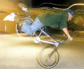 | dump truck | First there was the Caboose; where you scuffed with the bike trailing somewhat behind you. When a way was devised to roll into that trick instead of just Endo, people called it a Dumptruck...cuz you're rolling with the bike in front of you and in one motion you dump it behind you. Kevin Jones 1987 At the 1987 AFA Masters finals in Carson, CA., Kevin Jones amazed people. His routine was incredible. He put together impossible tricks and even turned his bike upside down while riding a wheelie from the rear pegs (a trick he calls the dump truck), and he never touched the ground at all. |