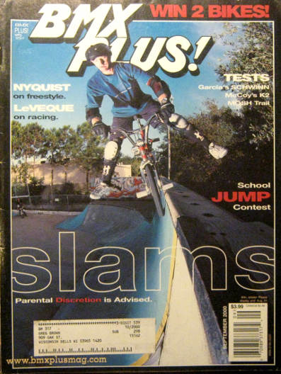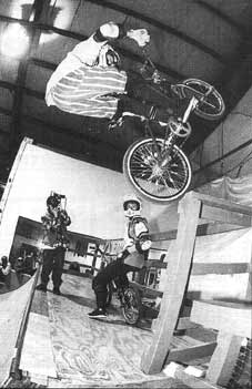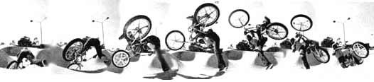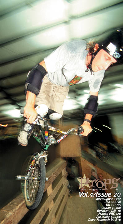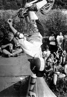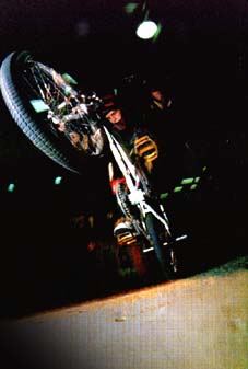 Lip tricks: a series of tricks so named because they are done using the coping and decks of a ramp. The beginning: When freestyle started out, the only ramps people really rode were sketchy quarterpipes, wedge ramps, and cement skateparks (if you lived in Southern California and had balls of steel). Even then riders were doing lip tricks, but it was more kick turns, fly-outs, and drop-in variations than anything else. Ron Wilkerson was one of the guys pushing lip tricks the hardest, and he was responsible for things like Miami Hopper drop-ins, pedal-picker drop-ins, and abubacas- and he was blowing peoples minds in the process. Around the early-to-mid '80s, the mini ramp slowly started to show up. As Dennis McCoy remembers, "We had a quarterpipe n my parents' backyard (in 1984) that we were tearing down, and we decided to cut it down to a mini ramp size. I actually learned 540-tailtaps and stuff that's common now a long time ago. We didn't really name tricks back then. It was just, 'Let's do this on this little ramp.' " Mini ramps really started gaining popularity a few years later, but McCoy and the Kansas City crew didn't consider lip tricks really pulled until they did them on vert. Wilkerson had somewhat the same mentality when mini ramps showed up. Ron says, "It was kind of like a cop-out. Like, if you can't do stuff on a big ramp you go to a mini ramp. If you weren't man enough, you'd ride a mini ramp. That's how t used to be. » Ron did appreciate the less damaging effect of a mini ramp crash, though. He says, "Before (mini ramps) you'd come up with an idea for a lip trick on a vert ramp and you'd have to bust your ass learning it. Then you could learn them on a mini ramp and you wouldn't fall as hard." The Rampage Crew: Around 1987, the original Standard Bykes crew of Rick Moliterno, Krt Schmidt, and Bill Nitschke got into the mini ramp game, and then things really started picking up. For an example of how hard these guys were pushing it, look no further than Standard's first video, "Rogers Garage." Those three were doing things ten years ago that most riders still can't do today. Moliterno and Schmidt even added a twist by doing a lot of amazing fakie tricks that never really became as popular as their other tricks. Clink, Clank, Clunk: The mini ramp craze was in full-force by the mid-90s, and it almost became a game of, "How many lip tricks can you do at once?" At contests it was pretty common to watch riders do something like tailtap-to-nosepick-to-icepick-to-toothpick all in one trick. Wilkerson remembers, "Lip tricks became like 'clank clank' tricks." Begiinig of the century: The level lip tricks are at today is flat-out incredible, and now a new crop of riders is helping to push things even further. Dave Freimuth, Dave Osato, Ruben Alcantara, John Heaton, and others are doing things no one ever thought possible. (...) The Future: Even though so many tricks have been done on a mini, there's still a long way to go. | ||