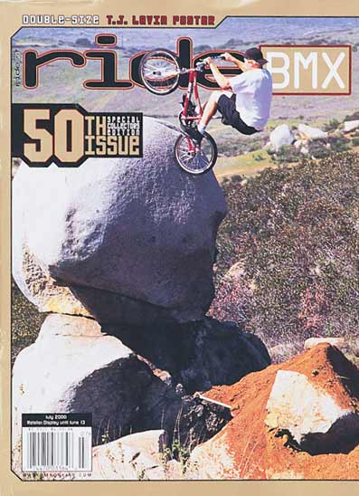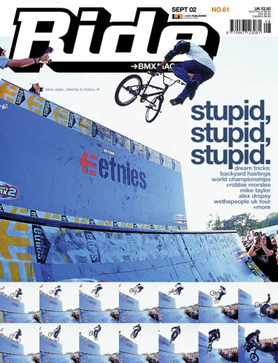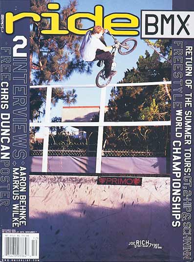 | backflip to sprocket | Matt Beringer 2000. Matt Beringer, Ride BMX US april 2001: I tried a flip fakie in England last year. I didn't know how to do 'em so I accidentally bashed my sprocket and then fell on my head. The idea's been in my head ever since. Then I was trying to steal John Heaton's flip to manual but I couldn't do it because it's too hard; so I got mad and tried flip to sprocket. I landed sprocket first time and I pulled it third try. |