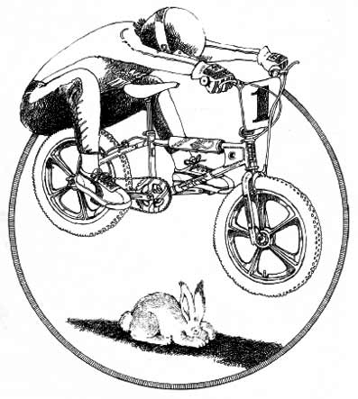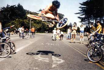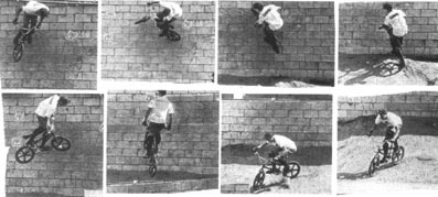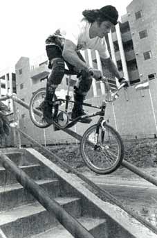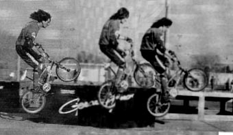 | Chris Moeller, aggrorag #10, summer 1989: Bicycle Street Riding is kind of an industry thing. The people at General started it, and then Hammer came along and they were really the ones who got it moving. They got the ball rolling. Hammer got it rolling, General started it and Fred Blood helped it out, with a lot of help from Hugo Gonzales 'cause he's in the circus. It's kind of an industry thing. They made it up. It's really fake. It sells a lot of bikes for General and Ozone. | ||